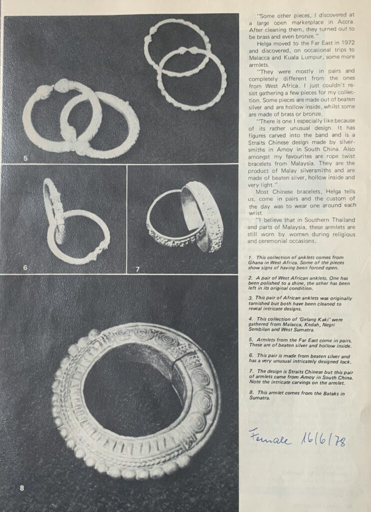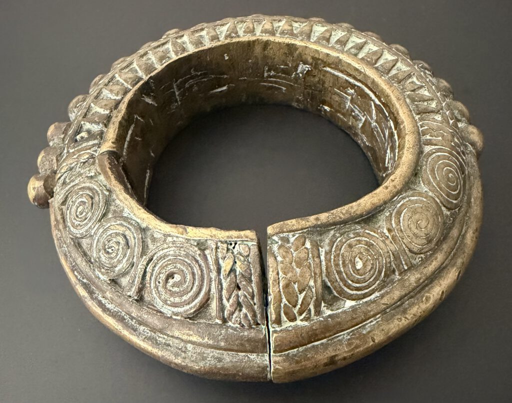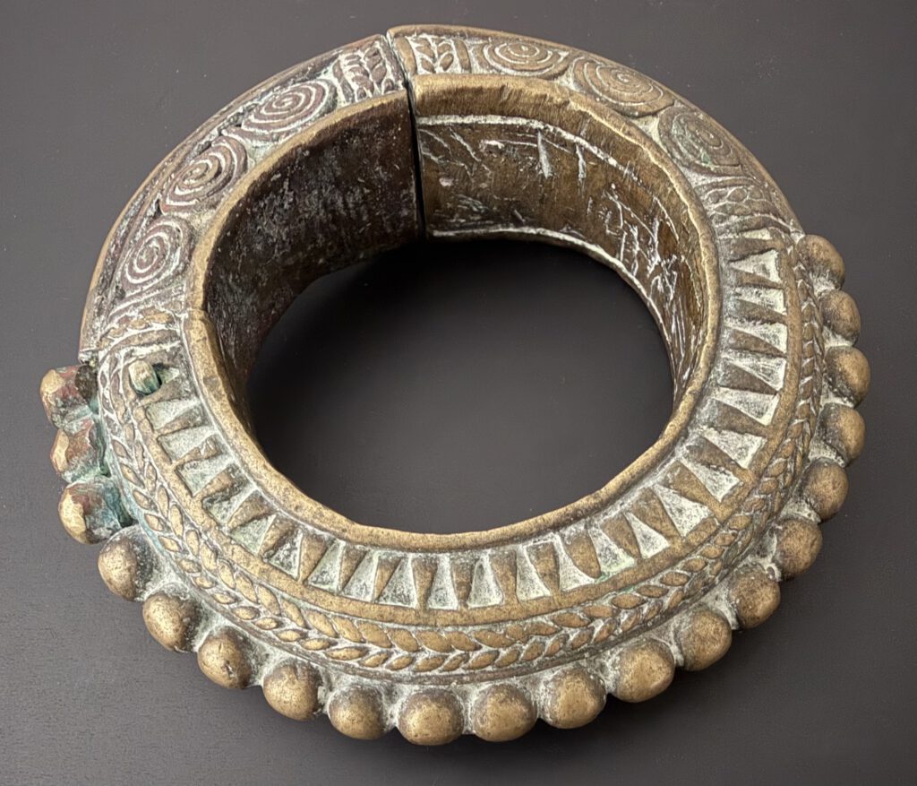 A published bracelet from the Batak on Sumatra. Heavy cast piece made from bronze. Dating from the 19th century. Outer diameter approx 9 cm. It is published in the magazine ‘Female’ back in 1978. Issue 16-6-1978. The article will be provided with the bracelet. In good condition. €250-