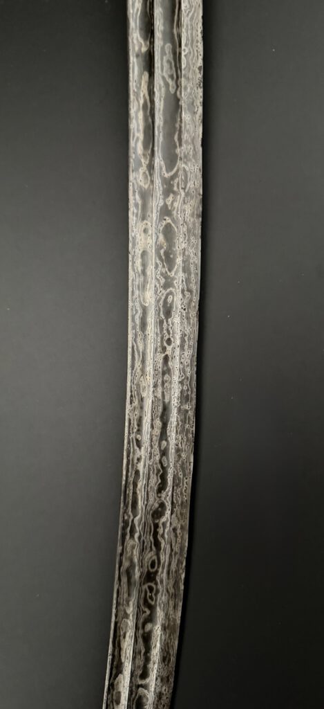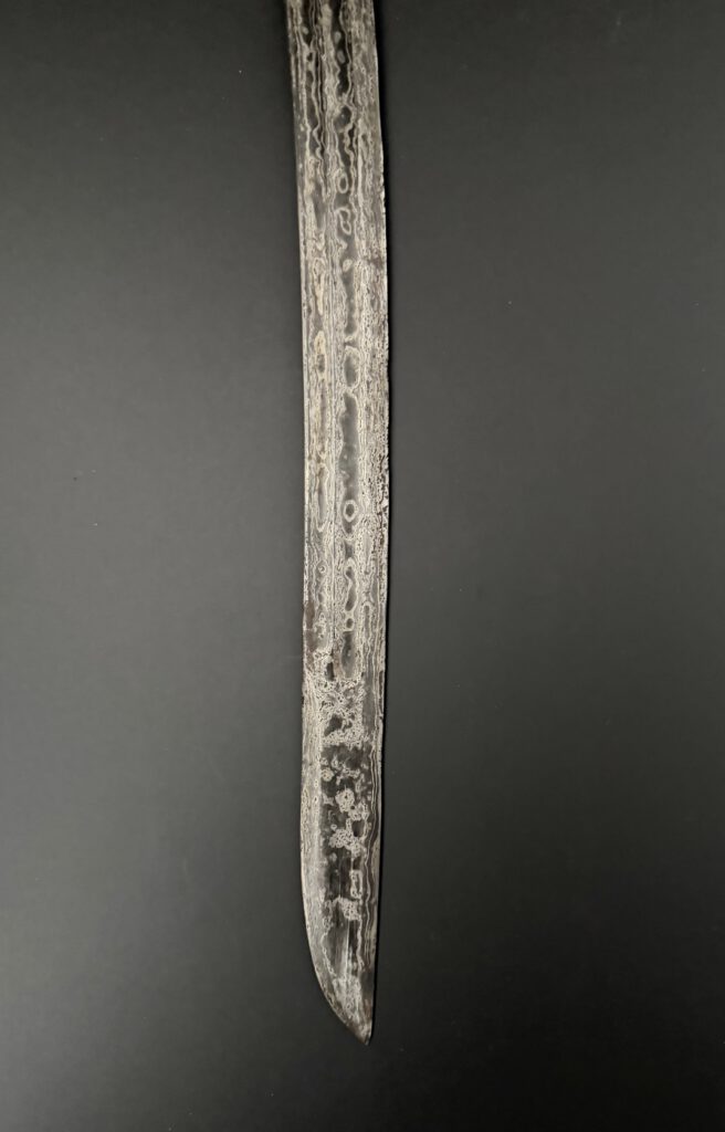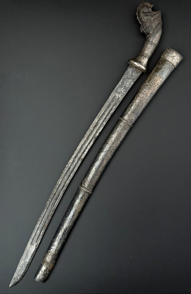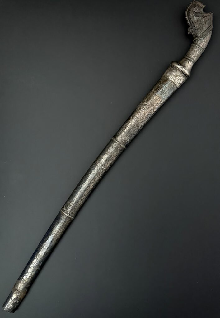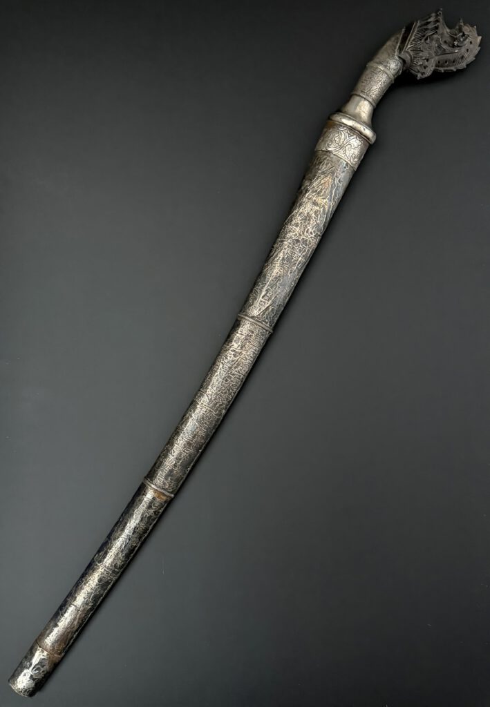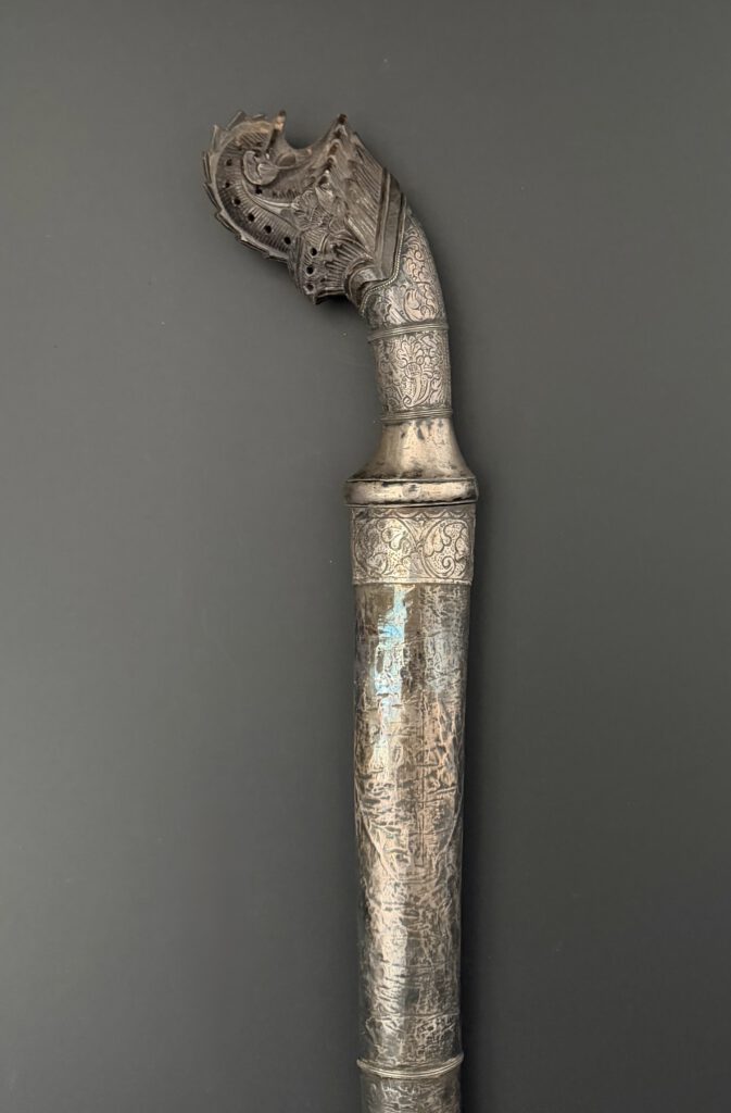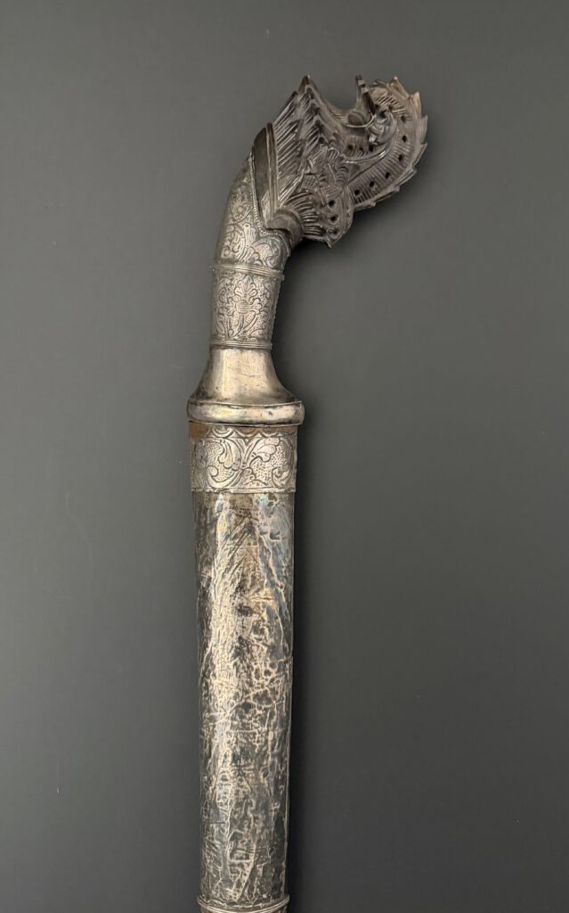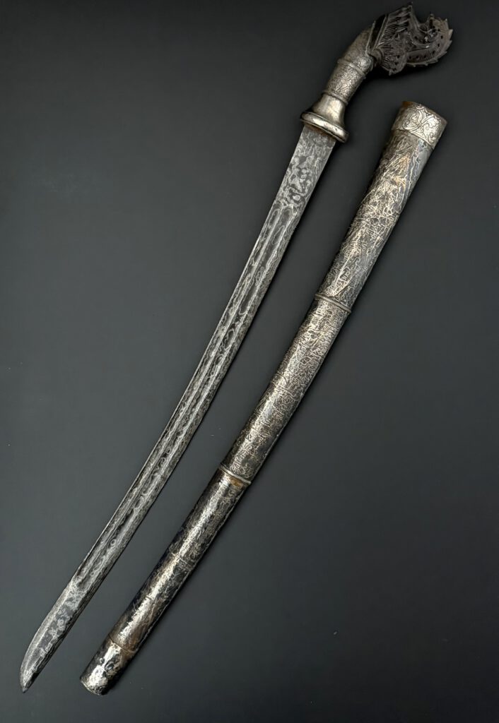 A pedang from Lombok. Very good example. Silver sheath. Handle made from silver and horn . The blade with double fullers on both sides and nice contrasting pamor. Total length 73 cm (unsheated). 19th century. €450-