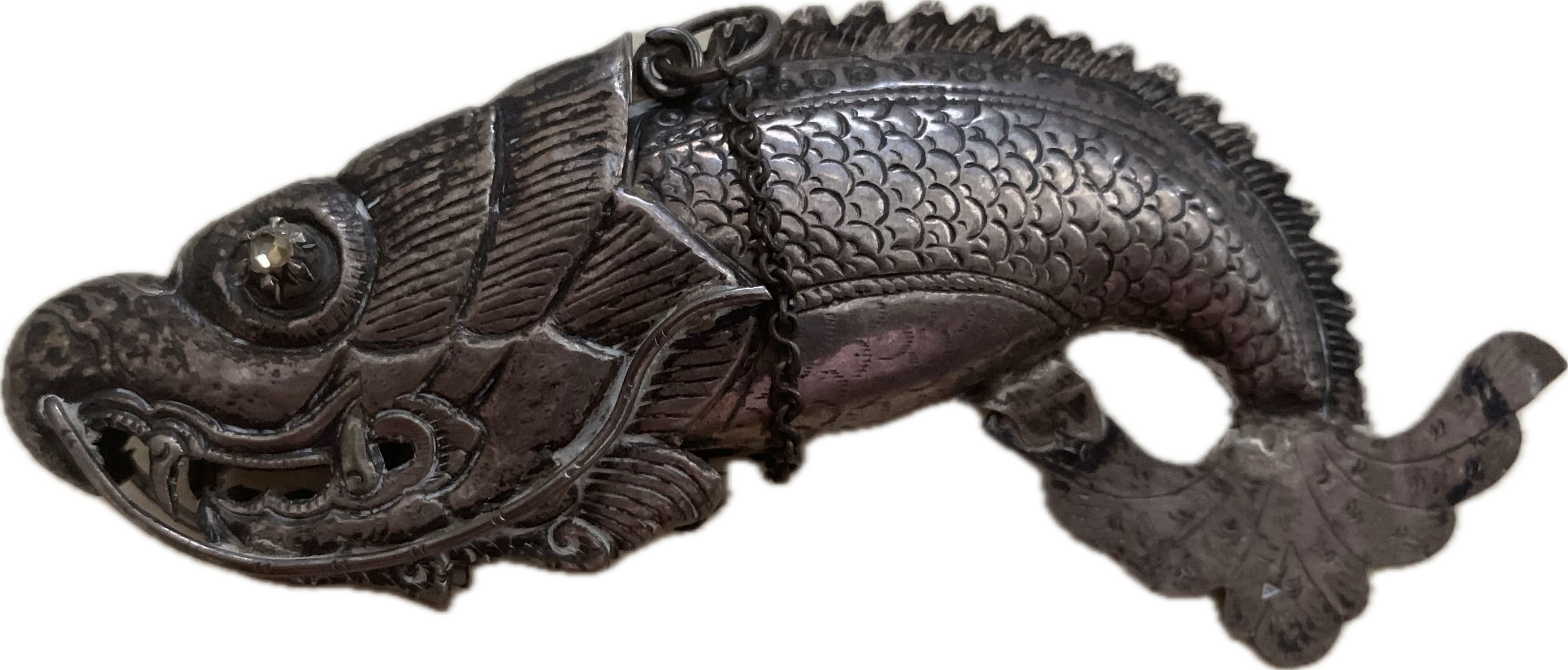 Sold-Javanese silver jewelry in the form of a fish, 19th century, silver. A very scarce piece of Javanese jewelry with Peranakan/chinese influence. Worn by Chinese boys living on Java Indonesia. Perfect condition, extremely hard to find. Ex Aalderink Amsterdam.