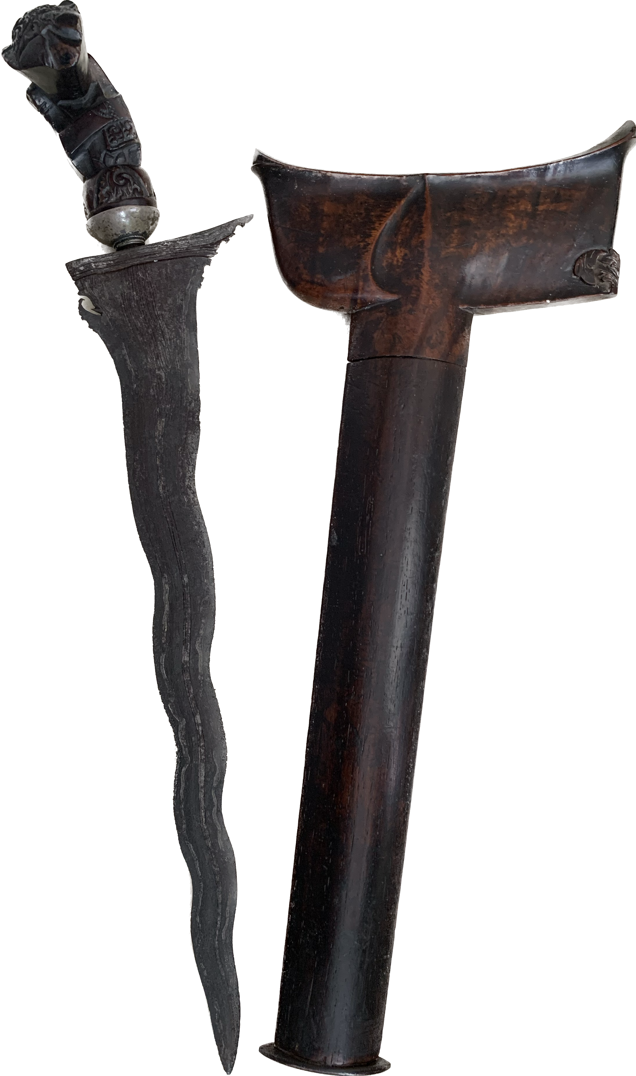 A Keris Palembang. Very good example. Wood sheath, Ivory ukiran. The blade is typical Palembang work, It shows traces of Kinatah work. The blade fits perfectly in the sheath. Total length 47 cm (sheated). 19th century. €425-