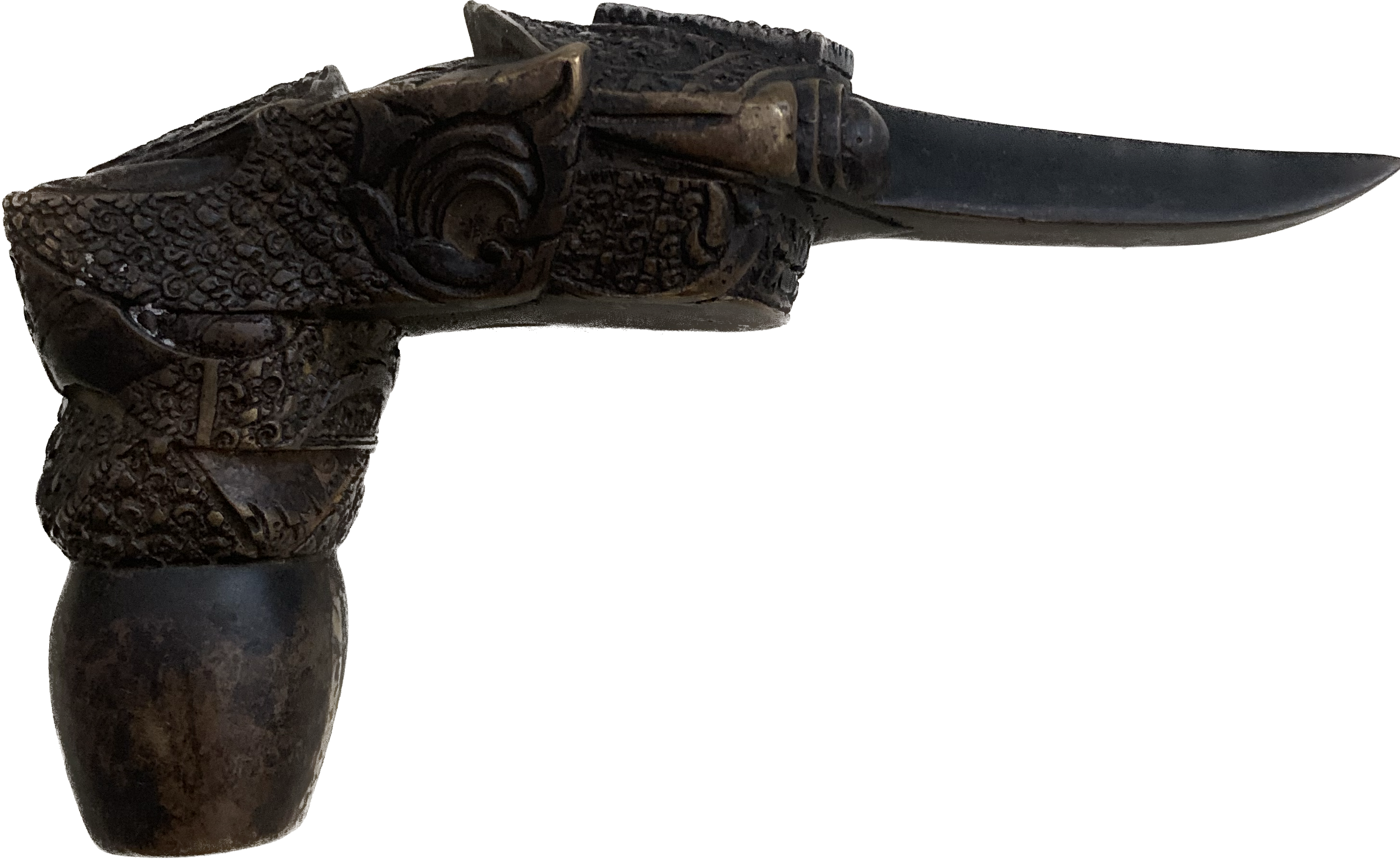 Sold – Coteng keris hilt, unknown age. Malay/Thailand. Made of brass. Lost wax method. W 13cm, H 7,3cm. Very fine details.